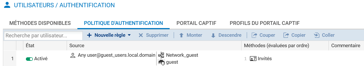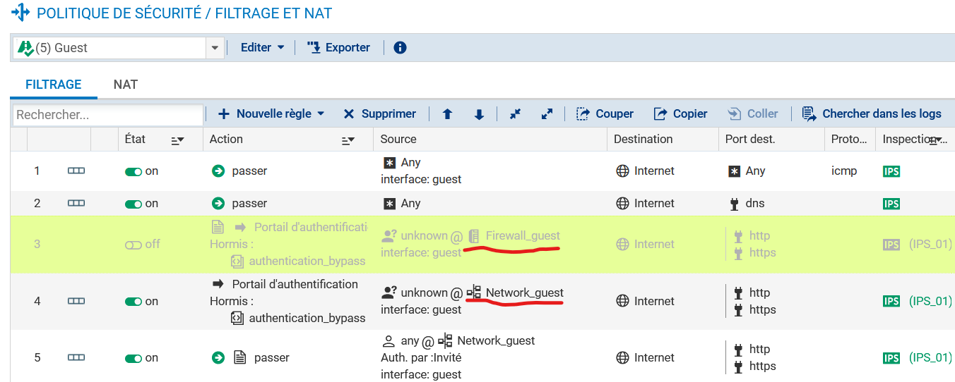 Attention: Ne pas se tromper de type d'objets: C'est bien les utilisateurs "Inconnus / unknow" du "réseau guest" (règle 4) et non de l'interface "FirewallGuest" (règle 3 désactivé sur la co^pie d'écran).