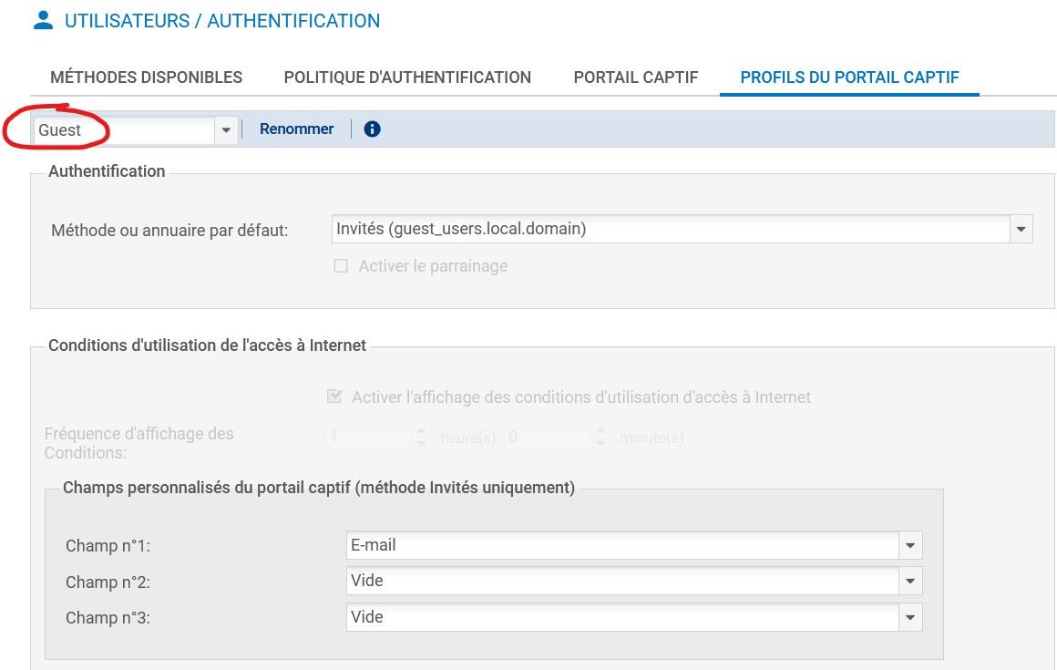 Dans l'onglet Profils du portail captif du module Configuration > Utilisateurs > Authentification, sélectionnez le profil Guest.