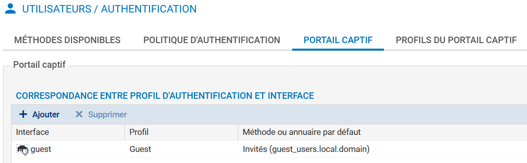 Dans l'onglet Portail captif du module Configuration > Utilisateurs > Authentification, ajoutez une correspondance entre l'interface réseau souhaitée et le profil Guest.