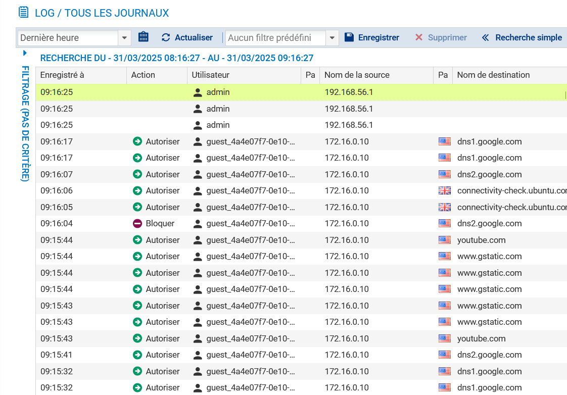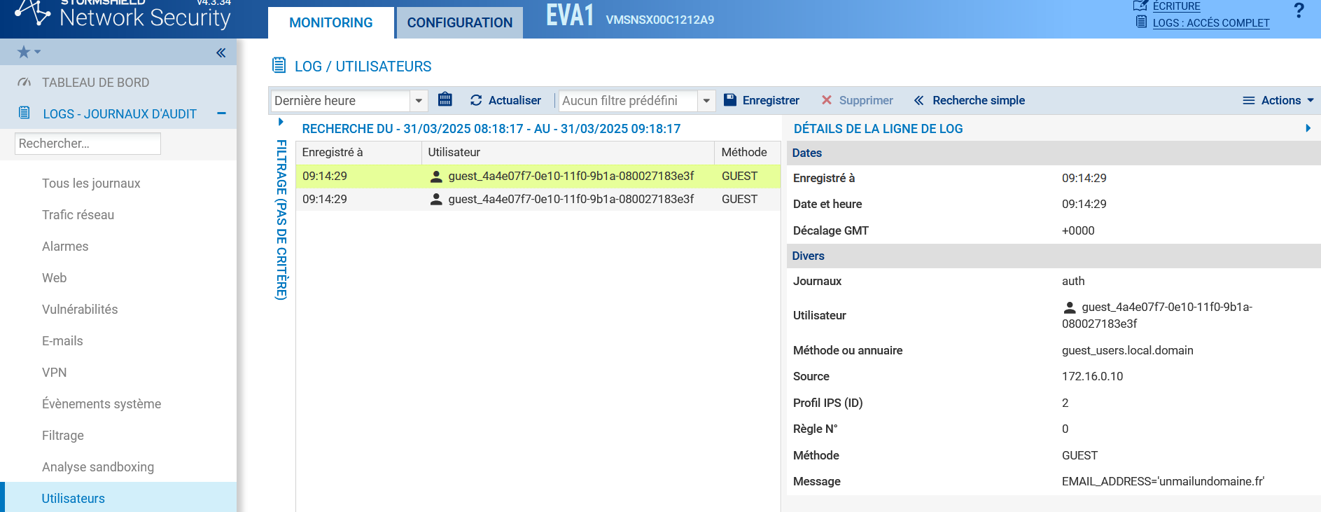 Les informations relatives aux connexions des utilisateurs invités, y compris les éventuels champs supplémentaires renseignés, sont enregistrées dans les journaux de traces du pare-feu.