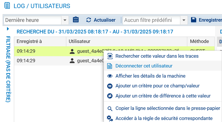 Un clic droit sur l'utilisateur permet de le deconnecter