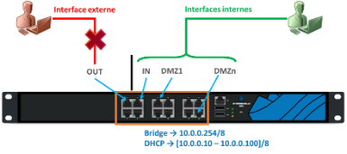En configuration usine, sur un boîtier physique de type SN210 ou SN310, toutes les interfaces sont incluses dans un bridge dont l'adresse est 10.0.0.254/8. Sur les boîtiers physiques, un serveur DHCP est actif sur toutes les interfaces du bridge et il distribue des adresses IP comprises entre 10.0.0.10 et 10.0.0.100. L'accès à l'interface web de configuration du pare-feu SNS se fait avec l'url : https://10.0.0.254/admin.