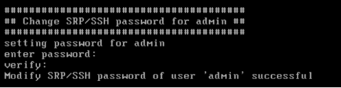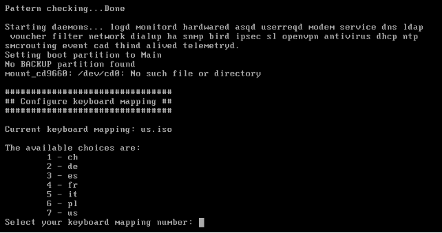 La configuration usine lance un dialogue de pré-configuration qui demande de changer le mot de passe par défaut, de configurer vos interfaces, le clavier de la console, etc :