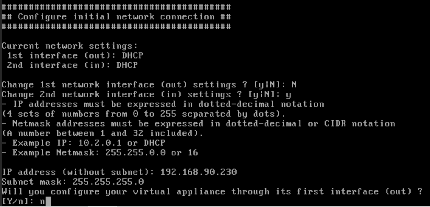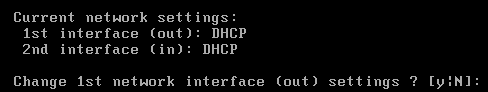 - Laisser l'interface IN en DHCP uniquement s'il y a un serveur DHCP sur le réseau sinon répondre « y » pour mettre une adresse IP accessible via le réseau. Par exemple :