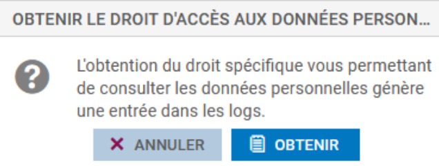 Le super administrateur « admin », ainsi que les administrateurs disposant du droit « Accès aux données personnelles » peuvent accéder aux logs complets en cliquant simplement sur Obtenir le droit d'accès aux données personnelles (logs). Cette manipulation ajoute une entrée dans les journaux qui permet de la tracer.