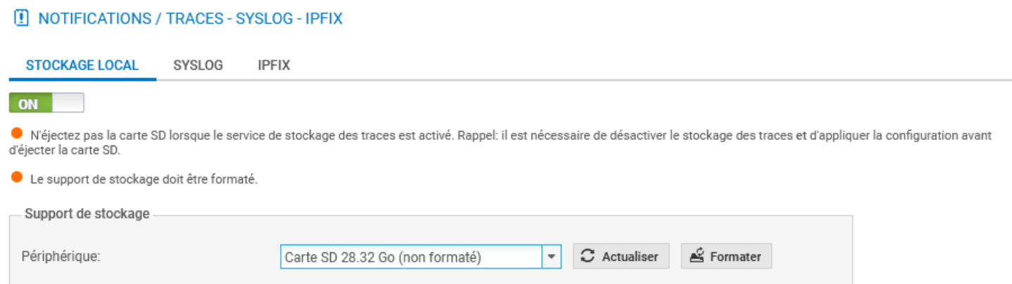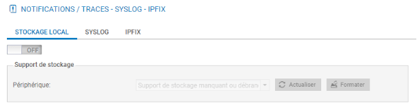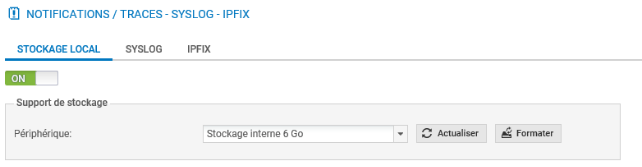 - Sélectionner dans le menu à gauche Configuration / Notifications / Traces -- Syslog - IPFIX puis dans l'onglet / Traces -- Syslog -- IPFIX choisir Stockage local.