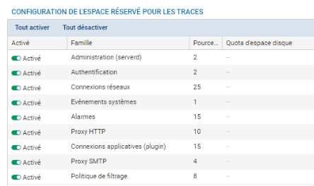 La zone Configuration de l'espace réservé pour les traces permet d'activer ou non l'écriture des traces pour une famille donnée en double-cliquant dans la colonne État correspondante. Elle permet également de configurer le pourcentage de l'espace disque réservé pour la famille de trace dans la partie Pourcentage. Il est important de noter que le total des pourcentages ne doit pas dépasser 100 %. La taille réelle de l'espace disque réservé à une famille de traces est indiquée dans la partie Quota d'espace disque.