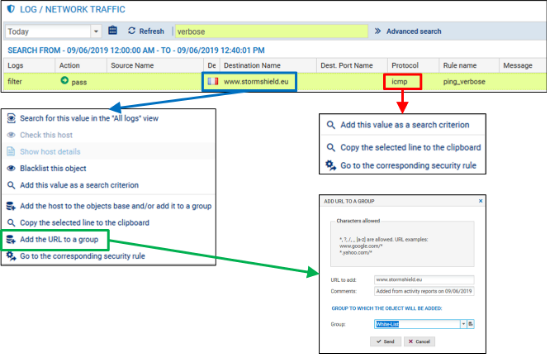Exemple : la famille Trafic réseau concatène les journaux Connexions réseaux, filtrage, Proxy FTP, connexions applicatives, Proxy POP3, Proxy SMTP, Proxy SSL, Proxy HTTP, VPN SSL.