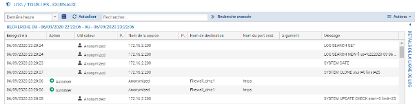 - Administration : regroupe les évènements liés à l'administration du pare-feu SNS. Ainsi, toutes les modifications de configuration effectuées sur le pare-feu sont journalisées.