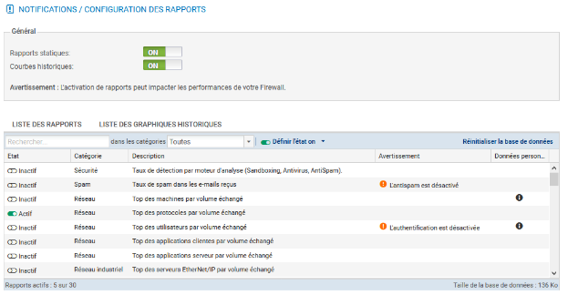 - Cliquer Configuration / Notifications / Configuration des rapports et activez l'option Rapports statiques, ensuite sélectionnez les rapports souhaités dans le panneau Liste des rapports.