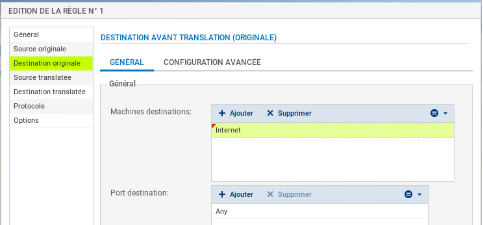- Destination définit l'adresse IP ou le réseau destination et Port destination translatée le port de destination.