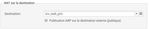 Exemple avec une règle de NAT afin qu'unserveur WEB (objet srv_web_priv, protocole http) soit joignable grâce à une redirection de port via l'adresse IP publique OUT d'un pare-feu: « 192.36.253.70 ».