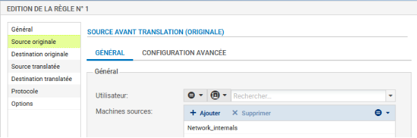 - Cliquer sur l'onglet Source translatée et sélectionner Firewall_Out dans Machine source translatée.