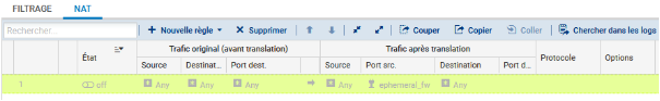 Une nouvelle règle non activée apparaît avec des valeurs par défaut any, any. Dans la section Trafic après translation, le port source sera traduit par un numéro de port choisi dans la plage ephemeral_fw.