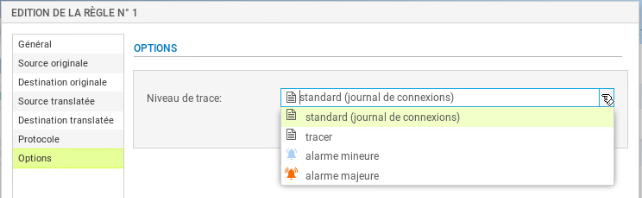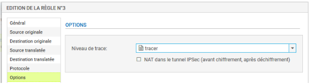 - Cliquer sur l'onglet du menu de gauche Options, cela permet de tracer le trafic qui correspond à la règle de traduction dans le journal de connexions, choisir tracer.