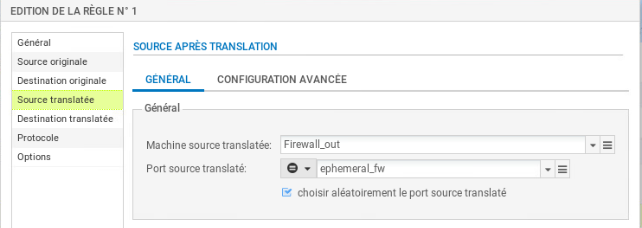 - Dans Port source translaté, laisser ephemeral_fw et cocher choisir aléatoirement le port source translaté.