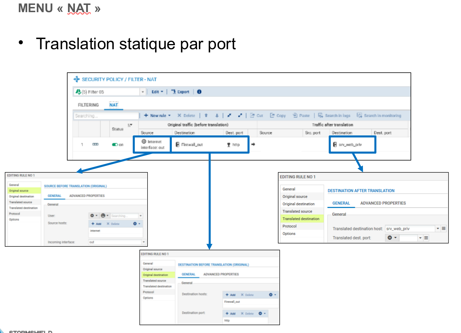 Destination translatée = srv_web_priv, Port destination translaté = none