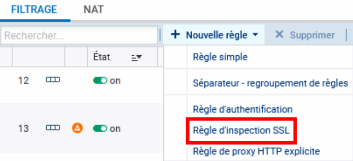 - Se rendre dans le menu CONFIGURATION ⇒ POLITIQUE DE SÉCURITÉ ⇒ FILTRAGE ET NAT => onglet FILTRAGE pour y ajouter la règle d'inspection SSL.