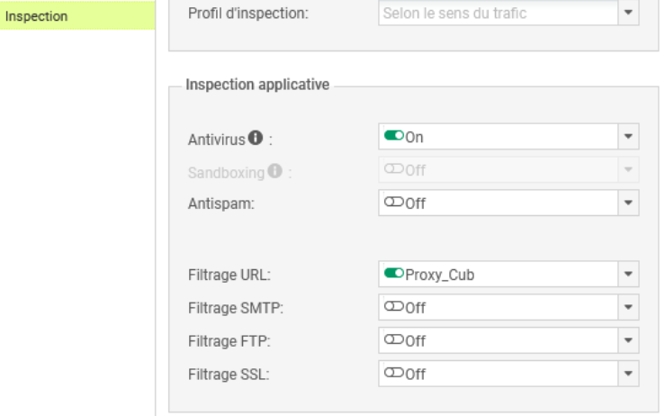 Vous pouvez également activer l'Antivirus ou l'Antispam et sélectionner des politiques de filtrage URL, SMTP, FTP ou SSL (vérification du champ CN du certificat présenté).