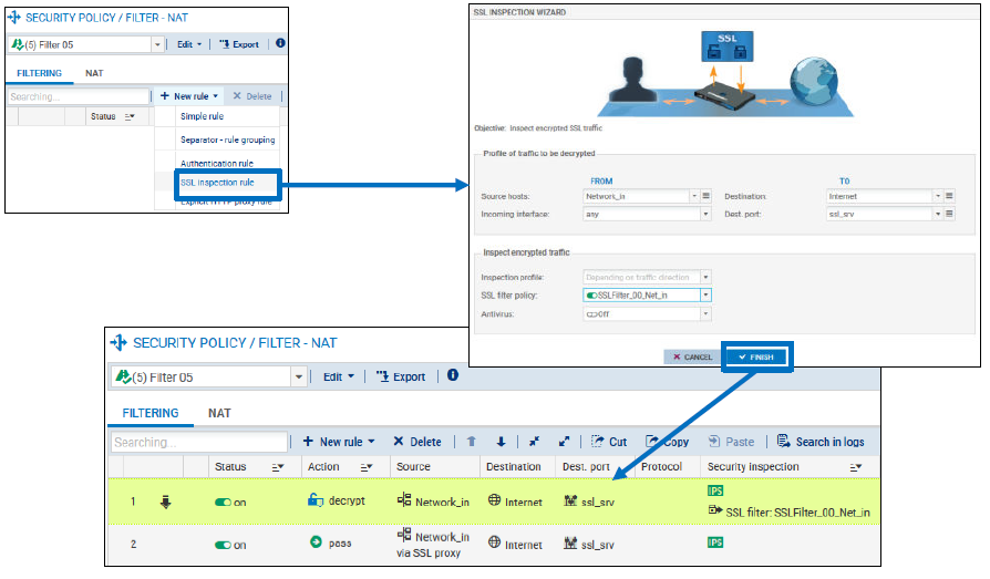 L' assistant « Règle d'inspection SSL » a pour but de créer des règles inspectant le trafic chiffré SSL. Il est conseillé de passer par cet assistant pour la génération des deux règles indispensables au bon fonctionnement du proxy SSL.