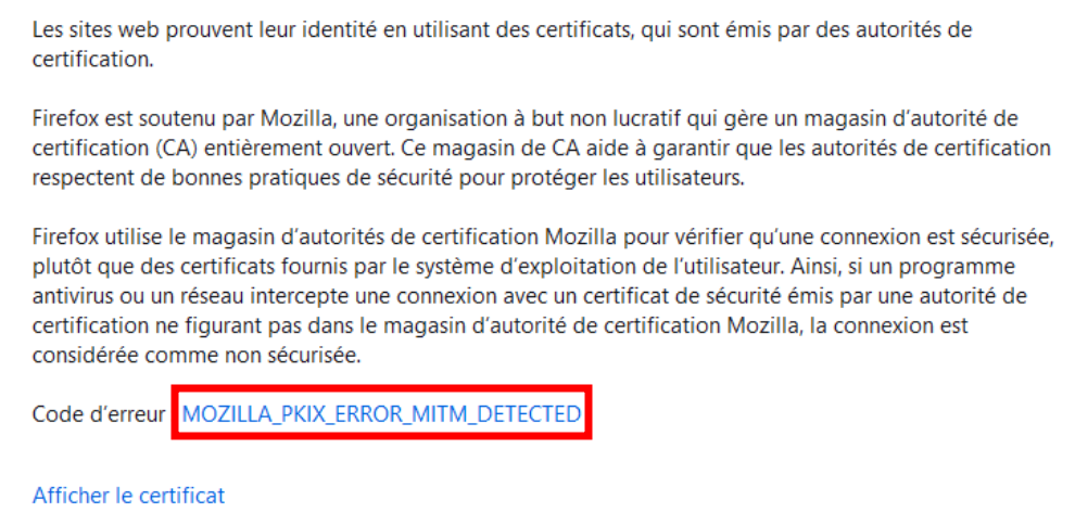 Lorsque le certificat serveur n'est pas conforme, l'accès au site est bloqué.