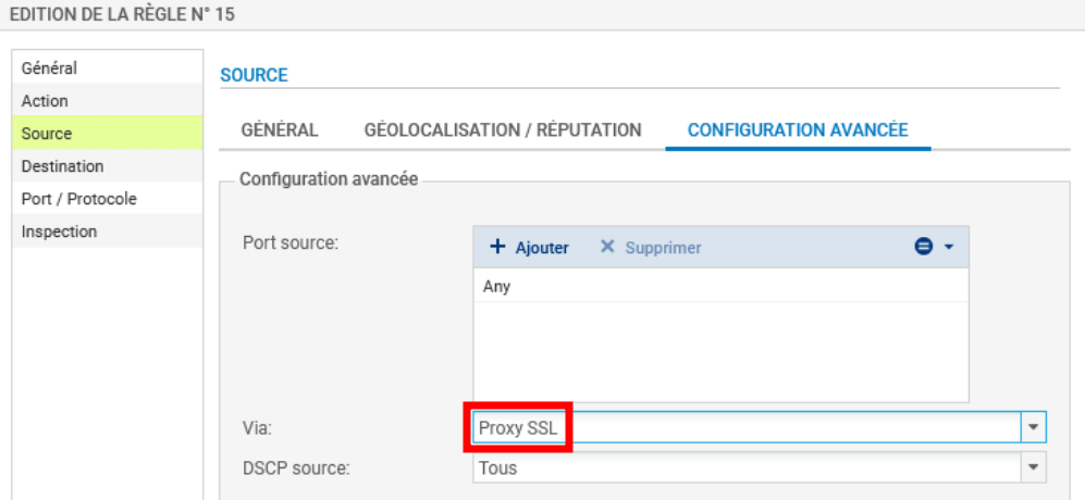 2. La deuxième règle autorise les flux provenant du réseau interne et sortant du proxy SSL (Via SSL proxy) à destination d'Internet. Les protections applicatives (Filtrage URL, Antivirus, antispam, etc.) doivent être activées sur cette règle.