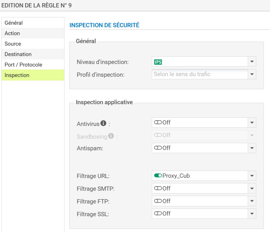 - Dans l'onglet Filtrage, ouvrir la ou les règles qui autorisent l'accès à Internet avec le protocole http. Dans l'onglet Inspection de sécurité, dans la zone Inspection choisir, dans la liste Filtrage URL, la politique de filtrage URL à appliquer.