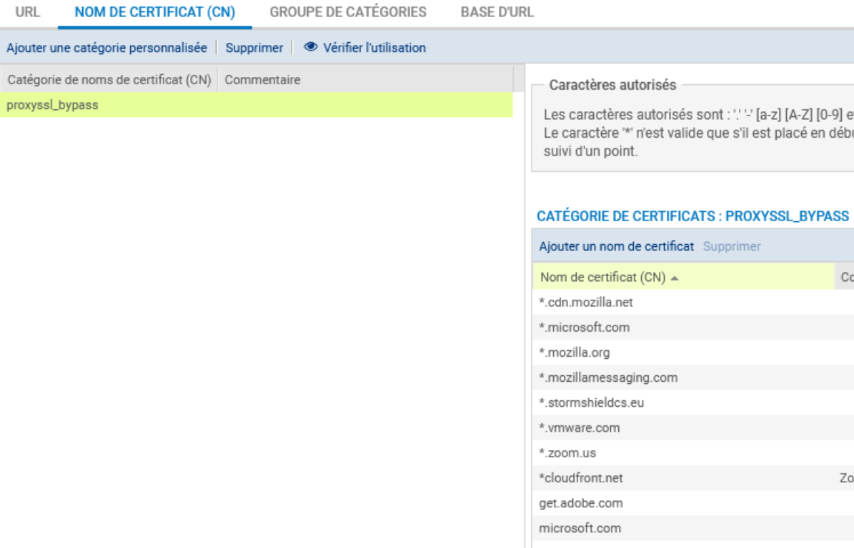 La catégorie par défaut proxyssl_bypass contient donc une liste de noms de certificats que Stormshield recommande de laisser passer sans déchiffrer.