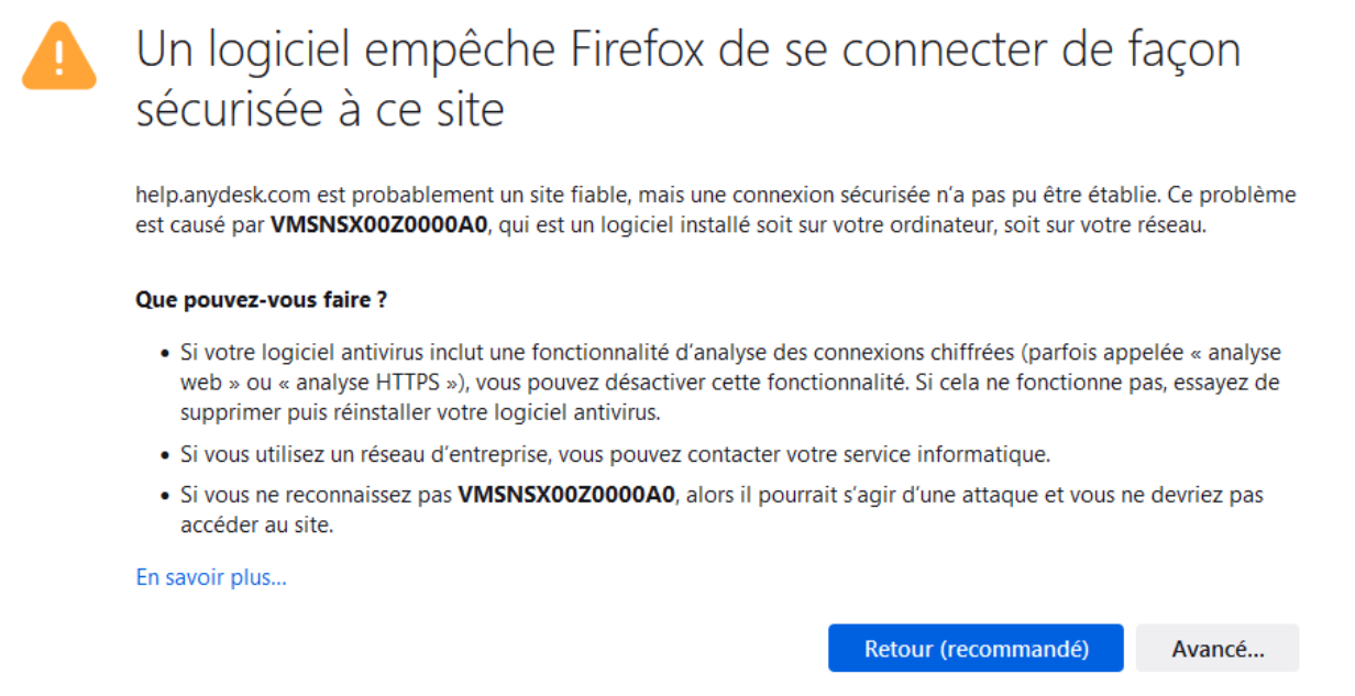 Le certificat du serveur n'est pas signé par une autorité de certification de confiance et il n'est pas explicitement déclaré en exception (ce choix est paramétrable),
