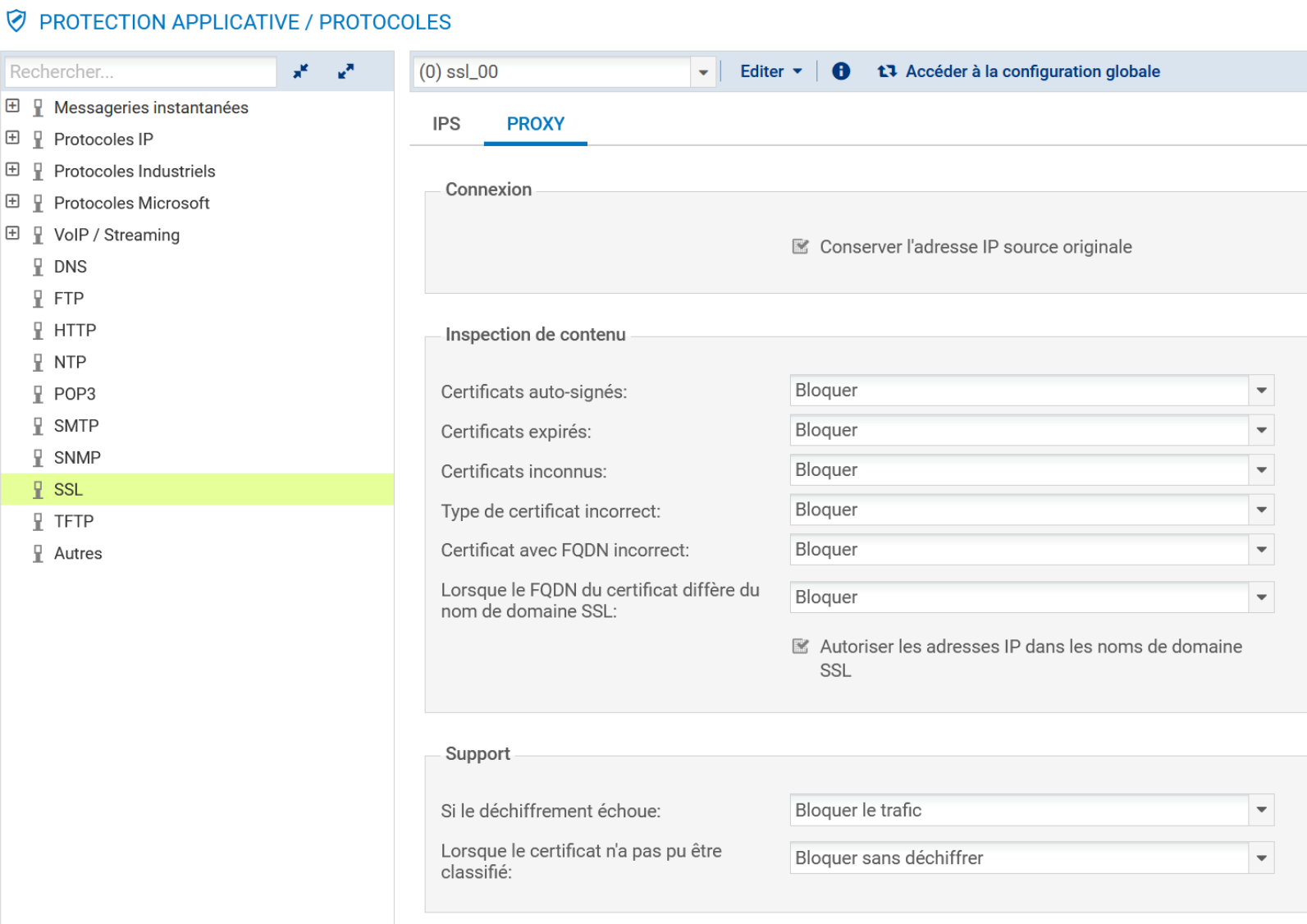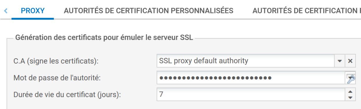 Par défaut, le proxy SSL signe les certificats usurpés avec l'autorité SSL proxy default authority déjà présente sur le firewall. La modification de cette autorité s'effectuedans le menu CONFIGURATION ⇒ PROTECTION APPLICATIVE ⇒ Protocoles ⇒ SSL ⇒ Accéder à la configuration globale ⇒ onglet PROXY.