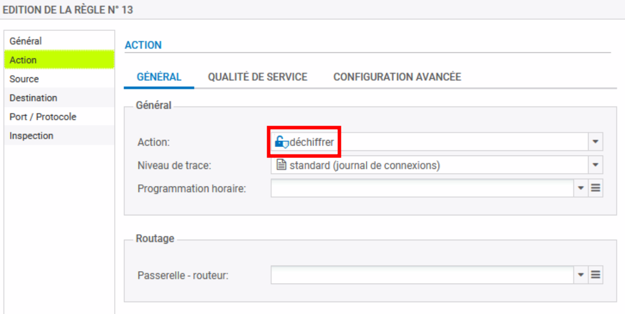 Définir, dans la première zone, la politique du trafic à déchiffrer en indiquant :