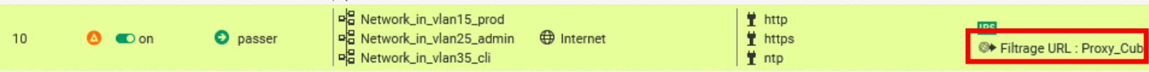 1. La première règle est utilisée pour intercepter les flux provenant du réseau interne à destination d'internet sur le groupe de port ssl_srv. Ces flux sont translatés à destination du proxy SSL qui écoute sur 127.0.0.1:8084. Cette règle applique l'action déchiffrer et le filtrage SSL.