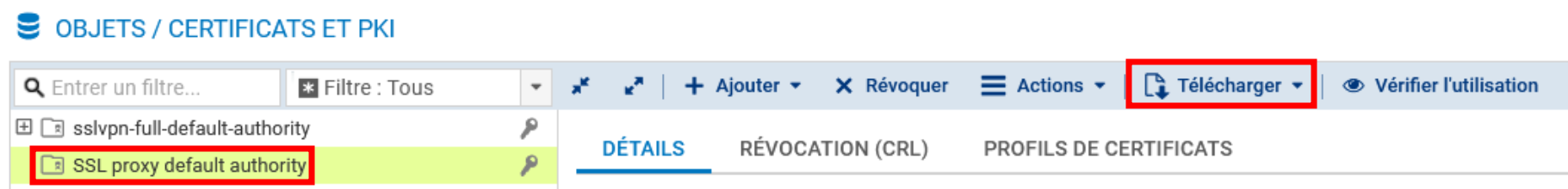 - Ou récupérer le certificat de la CA via l'interface web du firewall, dans le menu CONFIGURATION ⇒ OBJETS ⇒ CERTIFICATS ET PKI