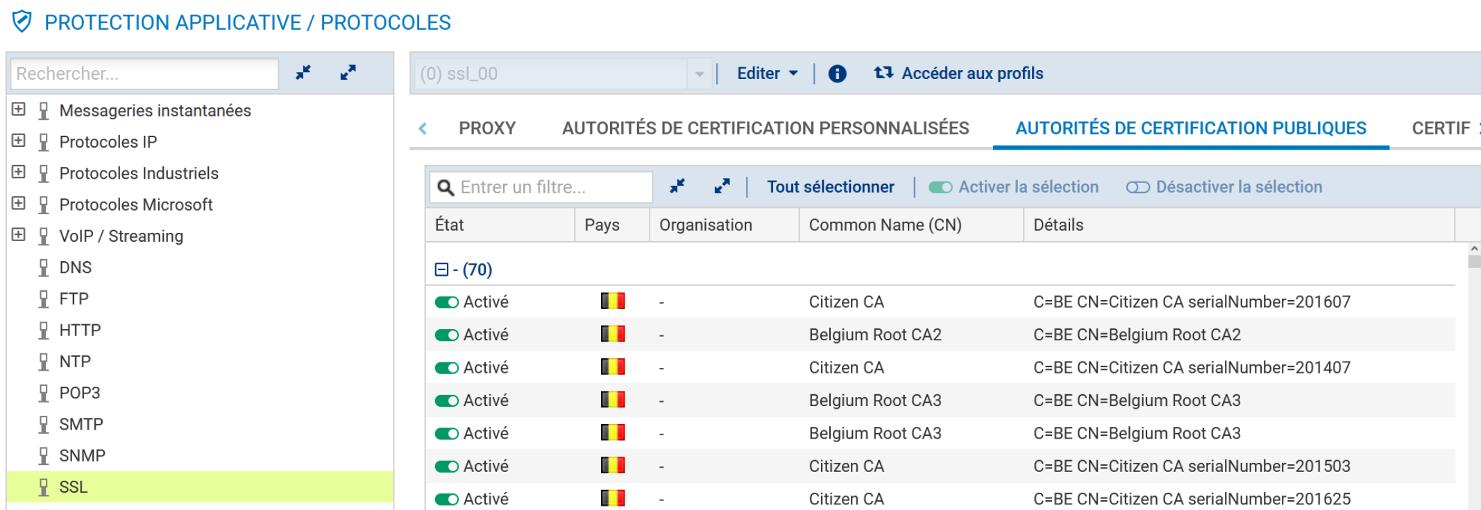 Elles sont accessibles depuis le menu CONFIGURATION ⇒ PROTECTION APPLICATIVE ⇒ Protocoles ⇒ SSL ⇒ Accéder à la configuration globale ⇒ AUTORITÉS DE CERTIFICATION PUBLIQUES. L'interface permet d'activer/désactiver une autorité en cas de besoin.