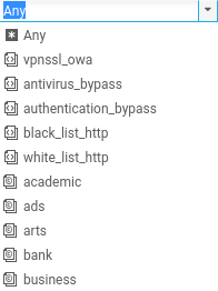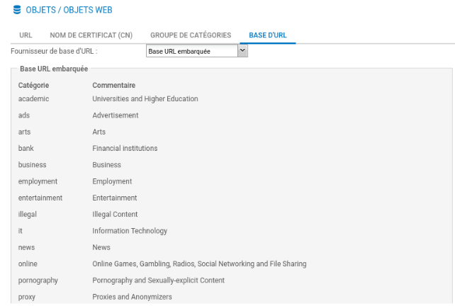 Les catégories prédéfinies pour la Base URL embarquée sont disponibles. Le contenu des catégories ne peut pas être consulté. Cependant, l'appartenance d'une URL à un groupe peut être vérifiée par le biais des champs de classification. Ces champs sont disponibles depuis le menu Objets Web ou au sein d'une politique de filtrage URL.