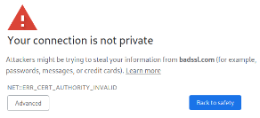 Le proxy SSL finalise l'établissement de la session TLS initiée par le client en lui présentant le certificat usurpé. Le client effectue une vérification du certificat. Dans le cas où le certificat de l'autorité signataire n'a pas été préalablement installé, dans le navigateur (pour Firefox) ou dans le système (pour Internet Explorer, Edge et Chrome), et déclaré comme une autorité de confiance, un message d'erreur s'affiche pour signaler au client que l'autorité signataire n'est pas connue. Toutes les communications entre le client et le firewall sont chiffrées avec la clé K2.
