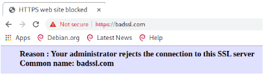 Dans le cas où l'accès à un site est bloqué par le proxy SSL à cause d'un des contrôles ci-dessus, l'utilisateur voit sur son navigateur un message indiquant la raison du blocage.