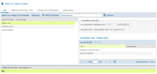 La règle numéro 1 (non activée) autorise les URL qui font partie du groupe authentication_bypass qui peut être consulté dans le menu Objets Web, il s'agit des sites qui permettent les mises à jour Microsoft.