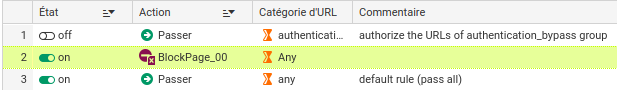 - Au niveau de la deuxième règle, dans Action, laisser BlockPage_00 et dans la colonne Catégorie d'URL, choisir black_list, puis cliquer sur Appliquer puis sur Sauvegarder.