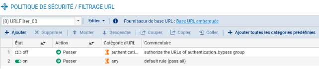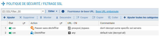 Pour chacune des 10 politiques de filtrage par défaut, deux règles sont présentes. La règle numéro 1 spécifie de Passer sans déchiffrer les URL-CN qui font partie de la catégorie proxyssl_bypass. En effet, ces serveurs détectent que le proxy SSL génère un certificat usurpé et sont susceptibles de refuser les connexions (c'est le cas par exemple de mozilla.org).