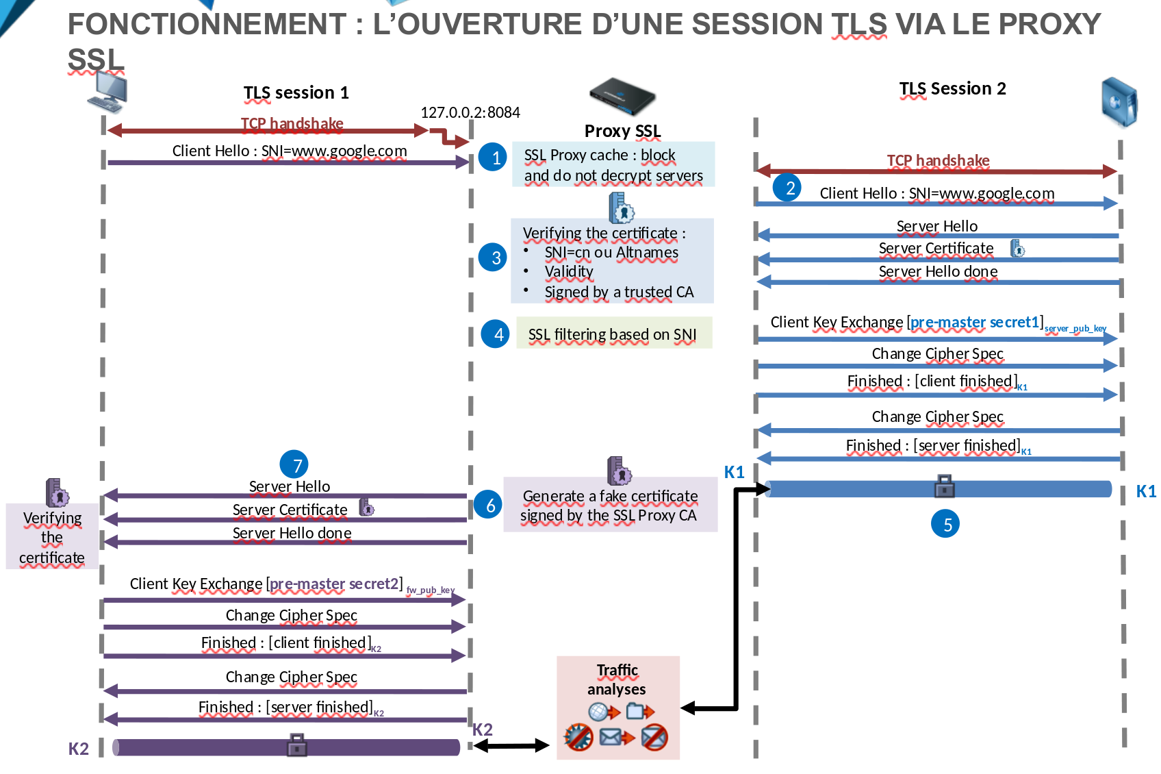 Pour pouvoir analyser les données chiffrées par un tunnel TLS, les firewalls SNS utilisent le proxy SSL qui est positionné comme « homme du milieu (man in the middle) » entre le client et le serveur durant l'ouverture de la session TLS. La figure ci-dessus illustre les différentes étapes de l'ouverture d'une session TLS pour une connexion HTTPS au travers du proxy SSL.