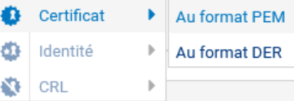 Identité : l'identité, puisqu'elle contient une clé privée, est sensible et son export doit être protégé par un mot de passe, lequel permet de chiffrer la clé privée qu'il contient. L'identité est pour rappel constituée de la clé privée du porteur, de son certificat (qui contient sa clé publique), et des certificats de la chaîne de confiance. Le fichier d'export est un container .pem ou un container PKCS#12 (ou .p12).