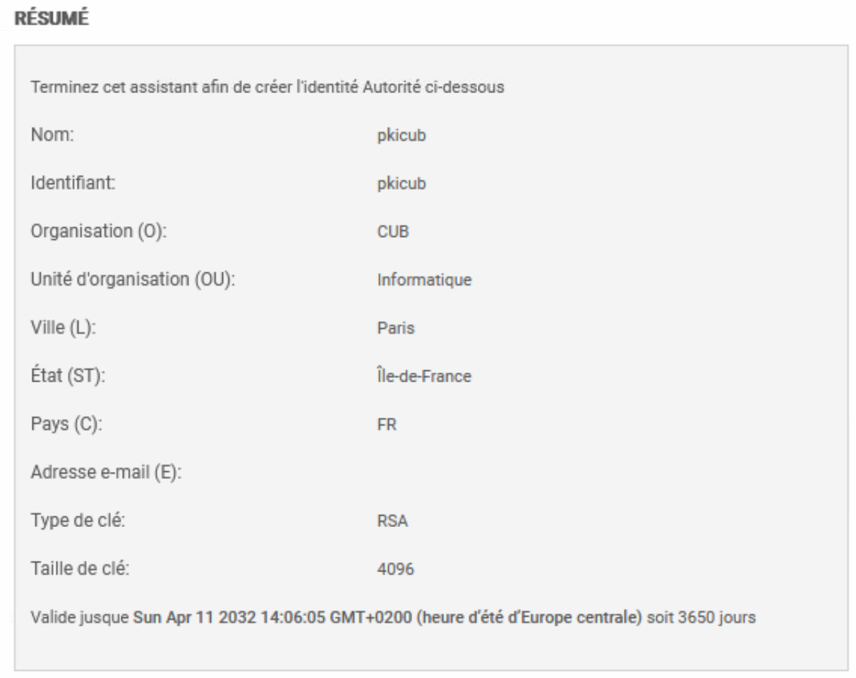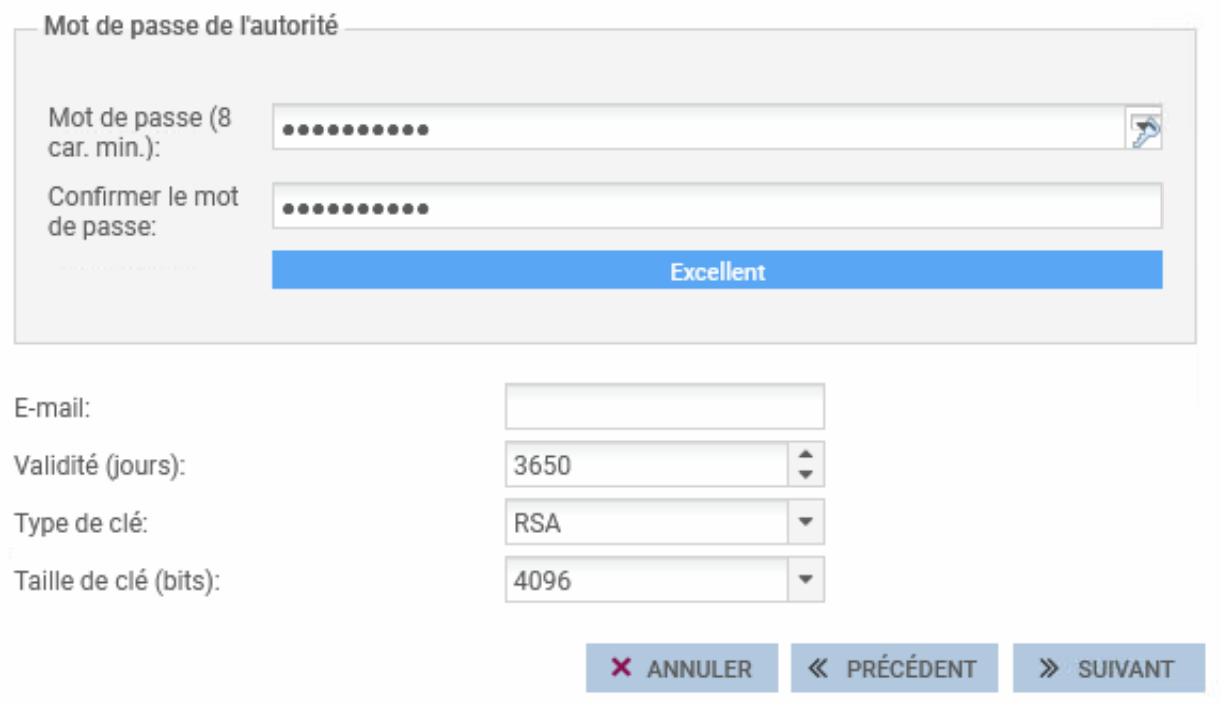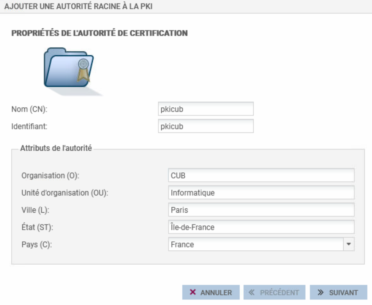 renseigner les attributs de l\'autorité. Ces informations seront présentes dans le certificat de l\'autorité ainsi que dans les certificats qu\'elle émettra :