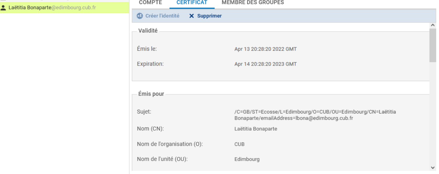 - Cliquer sur « Créer l'identité » ⇒ Le certificat de l'utilisateur s'affiche