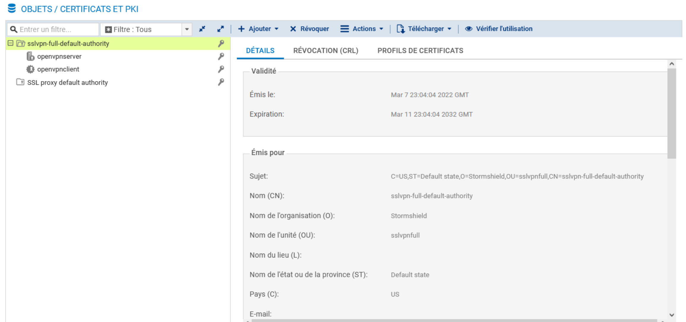 L'autorité est automatiquement ajoutée à l'arborescence des autorités, identités et certificats définis sur le firewall.